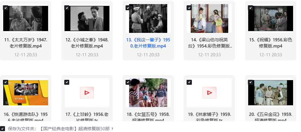 非常难得的老电影修复全集,见证了中国电影的发展历史。如果你是做影视解说的,那这就是绝佳的素材。如果你的父母还对这些保有记忆,不妨为父母领取一份,投屏到电视机上,让老人回忆一下自己年轻时候看过的节目,又何尝不是一份孝心能?